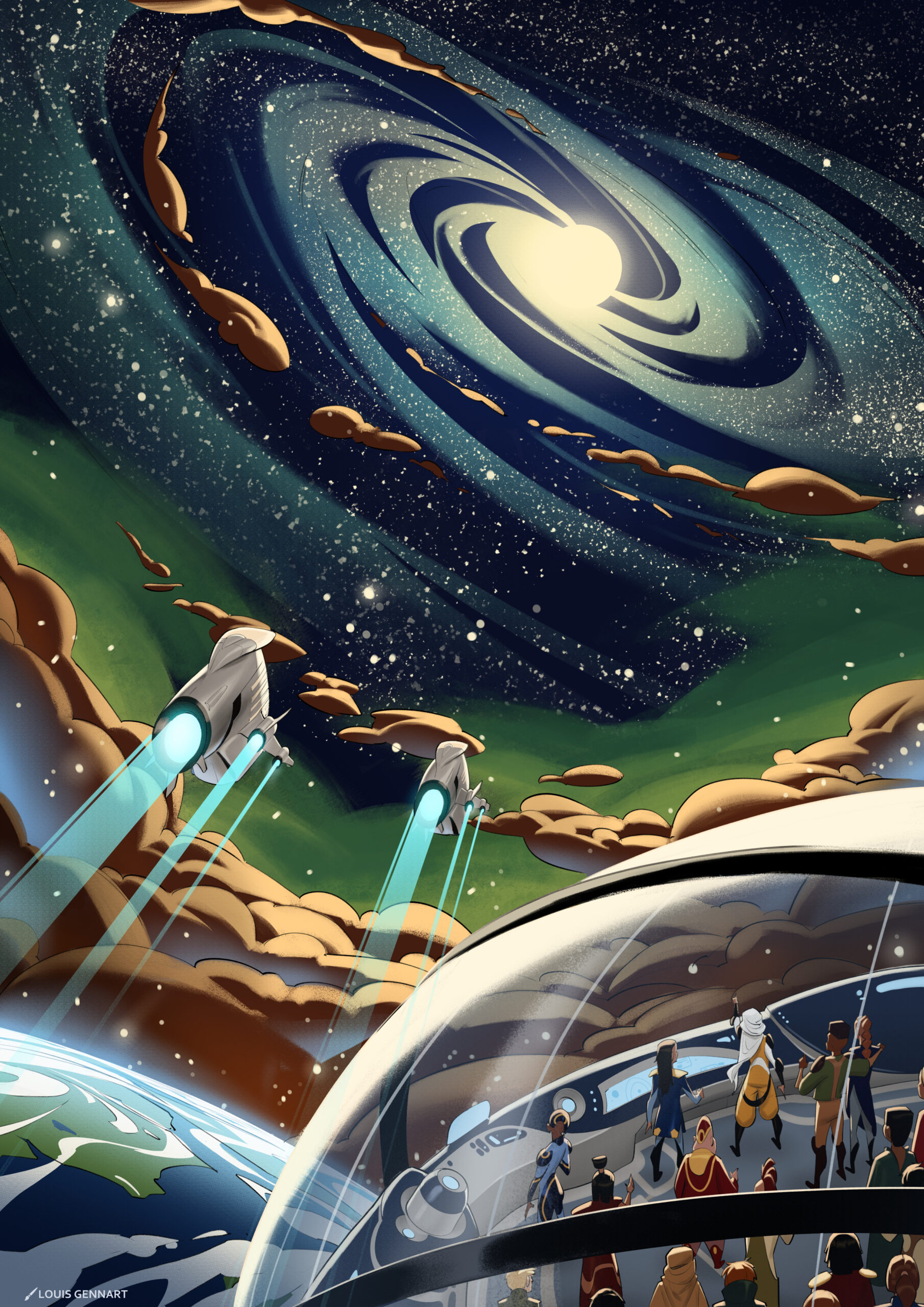 Two promotion posters created for a verbal joust organized by « Les Ambassadeurs d’expression citoyenne » in 2026. The theme of the year was « Towards tomorrow and beyond… ». The images bellow only show the illustrations for each poster without the text.